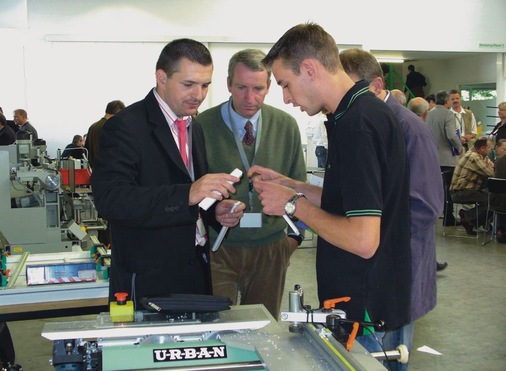 Im Bereich der Klebetechnik wartete man gleich mit zwei interessanten Maschinen auf. So gab es sowohl für die Falzgrund-Klebetechnik als auch die Überschlag-Klebetechnik interessante Lösungen zu sehen. Kleinmaschinen wie Ausklink- und Wasserschlitzfräsen sowie das komplette Programm an Schraubgeräten rundeten das Urban-Portfolio auf den Partnertagen 2007 ab.