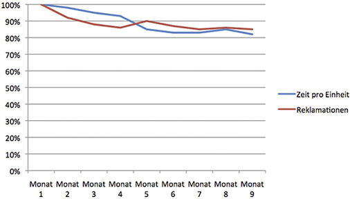 Auf Basis von realen Projektdaten sind hier die Einsparpotenziale zu sehen, die aus der Umstrukturierung der Workflows erzielt wurden. Ein Rückgang der Reklamationen ist zu beobachten. Die Verminderung der durchschnittlichen Produktionszeit pro Einheit war allerdings erst nach einer Gewöhnungsphase zu beobachten. Die Einsparungen durch die untersuchten Merkmale lagen deutlich über 10 Prozent.
