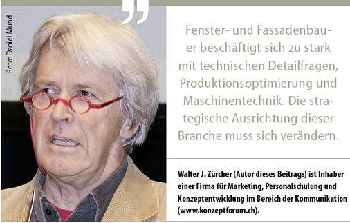 Der geschlossene Kreis der Fenster- und Fassadenbauer beschäftigt sich zu stark mit technischen Detailfragen, Produktionsoptimierung und Maschinentechnik. Die strategische Ausrichtung dieser Branche muss sich verändern, denn Fenster und Fassadenelemente sind weitgehend fertig erfunden. Die Erforschung kommender technischer Erweiterungen sind den Forschungsinstituten der Universitäten und Fachhochschulen zu überlassen, wo mit staatlichen Geldern neue Entwicklungen entstehen. Allfällige Partnerschaften von Zulieferern und Fensterproduzenten mit Forscherteams müssen im Bereich der Produktionsumsetzung getroffen werden. Der frische Wind in der Entwicklung wird auch dafür sorgen, wirklich neue Entwicklungsansätze entstehen zu lassen. Die Methode der Zusammenarbeit von Forschung und Produktion ist nicht neu, denn ganze Industriezweige bedienen sich der staatlichen Forschungsgelder. Ein Teil der somit frei werdenden Gelder aus der eigenen Entwicklungsarbeit muss sicherlich als partnerschaftliches Investment diesen Instituten abgegeben werden. Der verbleibende „Rest” dient der Finanzierung von Marketing und Information.