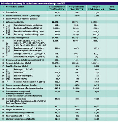 Einen sehr wesentlichen Einfluss auf den Stundenverrechnungssatz haben die so genannten „unproduktiven Stunden“. Von dem einen Feiertag, den Baden-Württemberger Arbeitnehmer in 2007 mehr haben einmal abgesehen, wurde bei dem sehr gewichtigen Anteil der „Gemeinkosten-Arbeiten“ ein Produktivitätsfortschritt von 5 Prozent-Punkten angesetzt, was gleich 25 mehr direkt verrechenbare Stunden ergibt, die sich in der weiteren Betrachtung sehr positiv auf den Stundenverrechnungssatz auswirken.
