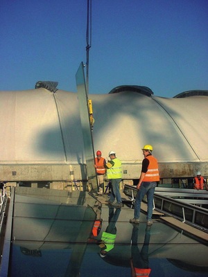 Dank der technisch gut gelösten Schwenkvorrichtung konnten die großen Scheiben problemlos von der vertikalen in die erforderliche Schräglage des Daches geschwenkt werden. Die Möglichkeit, die Scheibe mit der Arretiervorrichtung des Gerätes alle 3° halten zu können, erleichterte die Arbeit der Verglasungsspezialisten erheblich.