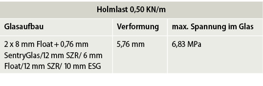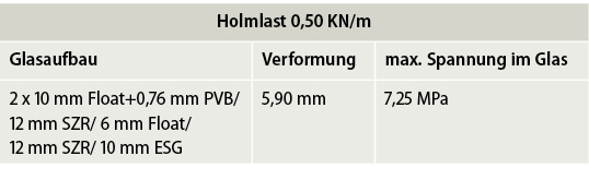 Nicht untypisch für Konstruktionen in Küstennähe oder in exponierten höheren Lagen wird für die äußere Scheibe eine Windlast von 1,2 KPa (Klasse 3 / DIN EN 12210) angenommen. Handelt es sich um ein Gebäude ohne nennenswerten Publikumsverkehr (private Anwendung), sollte die Holmlast 0,5 KN/m betragen.