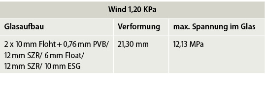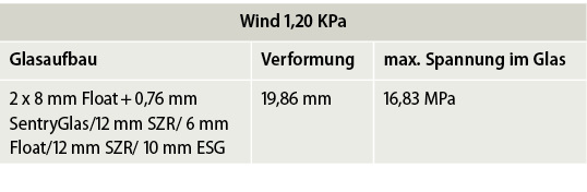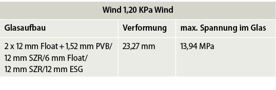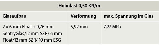 Bei den angenommenen Voraussetzungen und einer vierseitigen Lagerung, wie sie im Wohnbau üblich ist, reduziert sich das Gesamtgewicht der Scheibe zum Teil erheblich. Bei einer Konstruktion mit Standard-PVB sollte eine solche Scheibe folgende Merkmale aufweisen, wie die nachfolgende Tabelle zeigt: