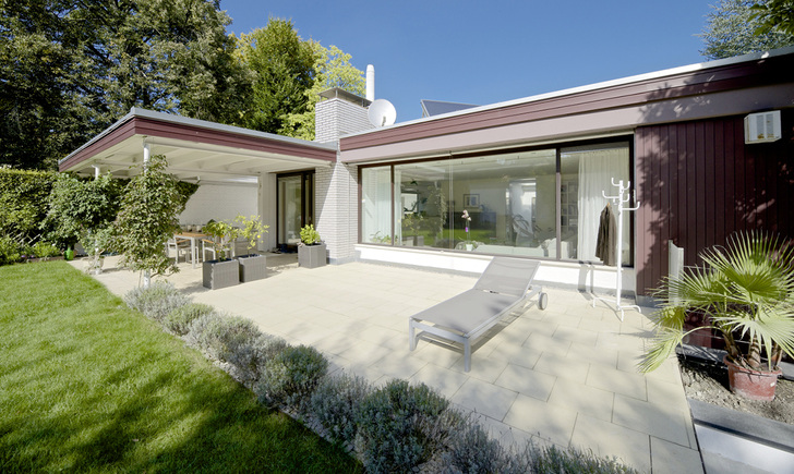 In einer Stadt im Zentrum Baden-Württembergs fand auch eine Ärztefamilie ihr Traum-Domizil in einem 200 m² umfassenden Bungalowexemplar und sanierte es im Jahre 2013 grundlegend in Hinblick auf den Energieverbrauch. Bodentiefe Fenstertüren und eine ins Freie verlängerte Stützkonstruktion setzen hier Haus und Garten miteinander in harmonische Beziehung und hebt die Grenzen dazwischen gleichsam auf.