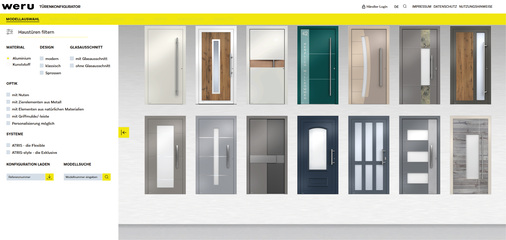- Der Haustür-Konfigurator: Schon seit vieln Jahren können sich Interessentinnen und Interessenten auf der Website oder direkt beim Fachhandel von WERU ihre Wunsch-Haustür konfigurieren . Aus mehr als 1.000 Ausstattungsvarianten kreieren sie sich ihre Haustür, deren überzeugender Detailreichtum die Kontaktaufnahme mit einem Fachbetrieb viel leichter macht.