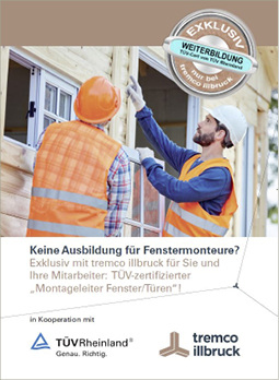 Eine klassische Ausbildung zum Fenstermonteur gibt es nicht. Doch die fachgerechte Montage von Fenstern und Türen gehört zu den anspruchsvollsten Tätigkeiten in der Gebäudesanierung. Besser für den Alltag gerüstet sind ab sofort alle Fenstermonteure mit der von der TÜV Rheinland und tremco illbruck initiierten Weiterbildung zum „Montageleiter Fenster/Türen“. Das Weiterbildungskonzept wurde zusammen mit dem TÜV Rheinland entwickelt und bietet den Abschluss „PersCert TÜV“. Dieser Abschluss stehe für geschultes Personal, getestet und zertifiziert durch eine neutrale Prüfstelle.