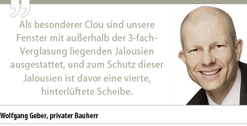 Geber – Die Fenster waren für mich ein zentrales und wichtiges Bauelement. Die bei uns verwendeten Fenster habe ich auf einer Passivhaus-Messe gesehen und war sofort begeistert, weil sie innen aus Holz gefertigt sind und außen eine wetterfeste Alu-Vorsatzschale haben. Doch ein besonderer Clou sind die außerhalb der 3-fach-Verglasung liegenden Jalousien. Zum Schutz dieser Jalousien sind die Fenster mit einer vierten, hinterlüfteten Scheibe ausgestattet. Damit bleiben die Jalousien trotz Sturm und Hagel dauerhaft in bestem Zustand. Hageldellen ade! Mittlerweile sehe ich immer mehr Fensterhersteller, die ebenfalls solche langlebigen Fenster anbieten.