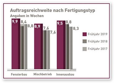 Bei den Auftragsreichweiten der Innenausbau-, der Fensterbau- und der Mischbetriebe ist eine spürbare Steigerung gegenüber dem Vorjahr festzustellen. Die Fensterbaubetriebe melden mit 9,9 Wochen die größte Auftragsreichweite (Vorjahr 8,4 Wochen). Aber auch die Innenausbauunternehmen verzeichnen sehr gute 9,5 Wochen.