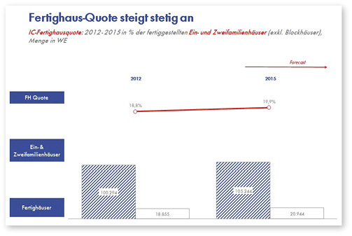 Während auf Märkten wie Österreich der Marktanteil der Fertighausbranche bei rund 35 % liegt, betrug der Marktanteil in Deutschland 2015 gerade einmal 19,9 %. Die Interconnection-Prognose geht dabei davon aus, dass sich der Anteil der Branche am gesamten Bauvolumen bis 2019 auf 20,9 % erhöhen werde. Grund dafür: Auch in Deutschland suchen die Konsumenten vermehrt nach schnellen und sicheren (Fixpreis) Lösungen in der Bauindustrie.