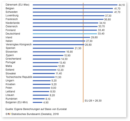 Arbeitskosten setzen sich aus den Bruttoverdiensten und den Lohnnebenkosten zusammen. 2017 zahlten die Arbeitgeber in Deutschland in Branchen des Produzierenden Gewerbes und der wirtschaftlichen Dienstleistungen auf 100 Euro Bruttoverdienst zusätzlich 28 Euro Lohnnebenkosten. Damit lagen diese in Deutschland unter dem EU-Durchschnitt von 31 Euro. Im EU-weiten Ranking lag Deutschland im Mittelfeld auf Rang 13. Auf 100 Euro Lohn wurden in Schweden (49 Euro), Frankreich (46 Euro) und Belgien (43 Euro) die höchsten Lohnnebenkosten gezahlt, in Malta (9 Euro) die niedrigsten.