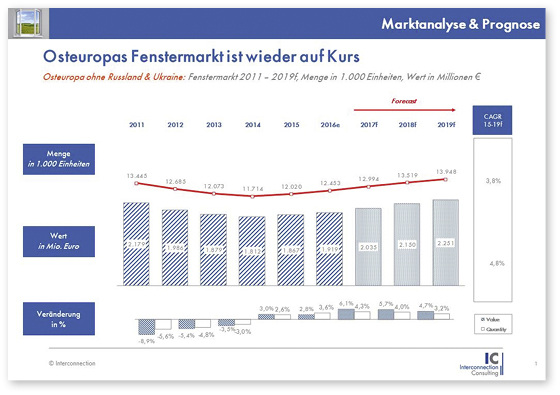 In den kommenden drei Jahren liegt das durchschnittliche Wachstum am gesamteuropäischen Fenstermarkt bei 2,6 % in Menge pro Jahr. Dies bedeutet, dass im Jahr 2019 mehr als 75 Mio. Fenster abgesetzt werden. In Anbetracht zahlreicher europäischer Krisen ist das positiv zu bewerten, gleichzeitig muss sich die Branche aber damit abfinden, in einem Markt zu agieren, der nachhaltig um ein Viertel seiner Größe geschrumpft ist. Lichtblicke kommen aus Deutschland sowie den skandinavischen Märkten, die akkumuliert um 3,0 % in Menge und 4,8 % in Wert wachsen werden.