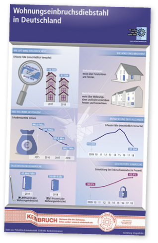 Insgesamt wurden im letzten Jahr 97 504 Fälle einschließlich der Einbruchsversuche registriert, 2017 waren es noch 116 540. Die Aufklärungsquote lag bei 18,1 %. Die Einbrecher verursachten im vergangenen Jahr einen Schaden (nur Diebesgut/Beute) von 260,7 Mio. Euro (2017: 302 Mio. Euro). Eingebrochen wurde meist über leicht erreichbare Fenster und Wohnungs- bzw. Fenstertüren.