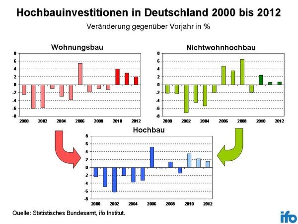 Eine nicht unwesentliche Stütze wird der europäische Hochbau auch weiterhin von umfangreichen Modernisierungs- und Renovierungsmaßnahmen erhalten. Lag der Anteil der Baumaßnahmen an bereits bestehenden Gebäuden 1992 noch bei rund 47% so werden es 2012 bereits rund 56% sein, wobei der mit Abstand größte Teil auf den Wohnungsbau entfällt.