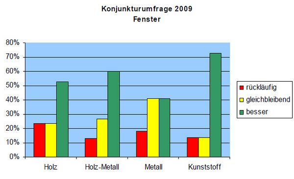 Gut entwickelt hat sich der Fenstersektor. Beim Rahmenmaterial Holz beurteilen 53 % die Lage als besser, bei Holz-Metall rund 60 %, bei Metall 41 % und bei Kunststoff 73 %. „Hier wirkt sich das Konjunkturpaket II positiv aus. Insgesamt betrachtet wird wieder mehr in den öffentlichen Sektor investiert. Benachteiligt ist allerdings der Metallbereich“, so Tschorn. Haustüren entwickeln sich ebenfalls positiv: Rund 33 % der Hersteller melden bessere Umsätze, bei Holz-Metall-Türen beurteilen 36 % die Lage als besser, bei Metall sind die Umsätze bei 38 % der Unternehmen gestiegen und im Bereich Kunststofftüren bei 58 %.