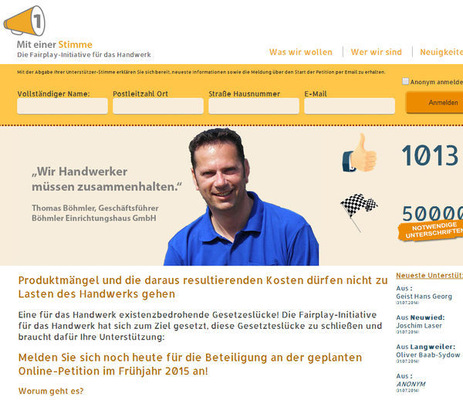 Die Handwerksinitiative „Mit einer Stimme“ will diesen für das Handwerk unhaltbaren Zustand ändern. Mit einer geplanten Online-Petition möchten die Mitglieder erreichen, dass der Bundestag dieser Ungerechtigkeit einen Riegel vorschiebt. Ein passendes Gesetz muss her. Bis zum Frühjahr 2015 versucht die Initiative deshalb, 50.000 Unterstützer zu sammeln und zu mobilisieren. Schon jetzt haben sich mehr als 6.700 Personen gegen die aktuelle Rechtslage ausgesprochen und sich auf der Homepage (miteinerstimme.org) eingetragen. Alle Unterstützer werden automatisch per Newsletter über Neuigkeiten informiert. Zusätzlich erhält jeder eine Benachrichtigung zum Start der Online-Petition, sodass die Stimme rechtzeitig abgegeben werden kann.