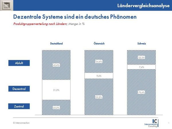 In allen Märkten werden zentrale Anlagen mit Wärmerückgewinnung vor allem im Neubau eingesetzt; ihre Entwicklung korreliert somit sehr stark mit der Baukonjunktur. 2012 hielt diese Produktgruppe einen mengenmäßigen Marktanteil von 32,5 %. Dezentrale Anlagen mit und ohne Wärmerückgewinnung werden hingegen bevorzugt in der Renovierung eingesetzt. Während letztere in allen drei Ländern anzutreffen sind, und einen mengenmäßigen Marktanteil von 41,6 % haben, sind Einzelraumlüfter ein deutsches Phänomen . Hier halten sie einen Marktanteil von 31,2 %.