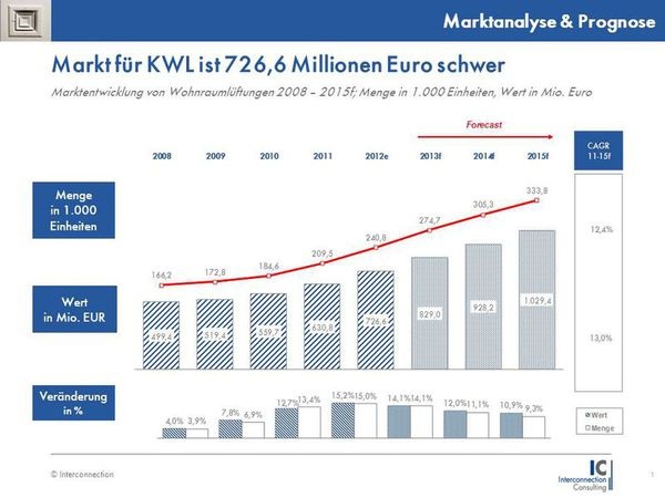 Renovierungsboom treibt Verkauf von Einzelrauml��ftern ��Interconnection rechnet damit, dass sich diese Ger��te in Zukunft in allen M��rkten etablieren werden. Der Grund hierf��r liegt in der Renovierung. In den letzten Jahren wurden viele Fenster ausgewechselt, sodass ein gro��er Bedarf an kontrollierter Frischluftzufuhr besteht. ���Einzelrauml��fter lassen sich schnell und einfach installieren; der W��rmer��ckgewinnungseffekt ist das ausschlaggebende Argument gegen��ber reinen Abluftanlagen���, so Dennis Rauen, Autor der Studie. Interconnection rechnet im Zeitraum 2012 bis 2015 mit einem j��hrlichen Durchschnittswachstum von 16,3 % in Menge.�� ��