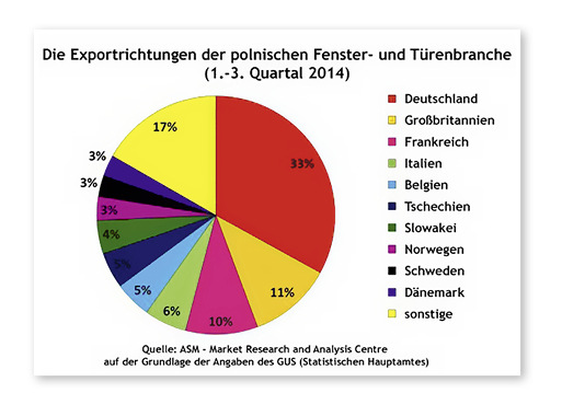 Die Hauptkunden für Fenster und Türen stammen dabei aus Deutschland, die ein Drittel der aus Polen exportierten Fenster und Türen kauften. Im Vorjahr wurde dort eine Rekordsteigerung um knapp 38 % gegenüber 2013 verzeichnet (auf 302 Mio. Euro für die ersten 3 Quartale).