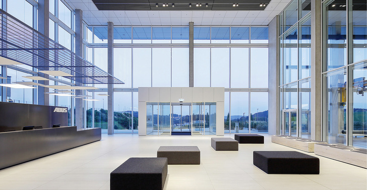Barrierefreien und sicheren Begehkomfort im großzügigen Eingangsbereich des Showrooms, der „KranHalle“, hat man mit automatischen Schiebetüranlagen in Fluchtwegausführung geschaffen. Sie fügen sich dezent in die Außenfassade ein und unterstützen das transparente Design des Windfangs, der auch als Personenschleuse dient. In Geze-typisch schmaler „7-cm-Optik“ bewegen leistungsstarke Slimdrive SL NT-Antriebe die fast drei Meter hohen Schiebetürflügel, die eine Öffnungsweite von fast vier Metern erzeugen.