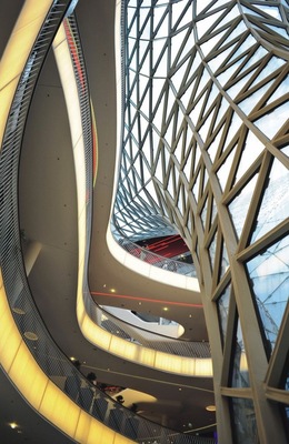 Die Gebäudehülle von MyZeil besteht aus einem prismatisch unterteilten gläsernen Schalentragwerk aus Sonnenschutz-Isolierglas. Die fließende Bewegung dieser Schale ist es, die das Glasbauwerk zum Blickfang in der Frankfurter Innenstadt macht. Rund 3500 Einzelscheiben mit dreieckiger Passform wurden für das gläserne Dachtragwerk benötigt. Jede Scheibe hat dabei einen individuellen Zuschnitt. Da die Fassade vom Außen- in den Innenbereich übergeht, kamen über 10 verschiedene Glastypen in verschiedenen Aufbauvarianten zum Einsatz. Die statische, energetische und lichttechnische Entwicklung der Scheiben übernahm Innoverre. Ebenso die Produktions- und Montagelogistik. Die Einzelscheiben wurden von Hero-Glas zugeschnitten, vorgespannt und laminiert. Okalux fügte die Einzelscheiben zum Verbund zusammen. Aufgrund der beengten Baustellenverhältnisse wurde die Stahlkonstruktion, bestehend aus mehr als 10000 Einzelstäben, weitgehend vorgefertigt. —