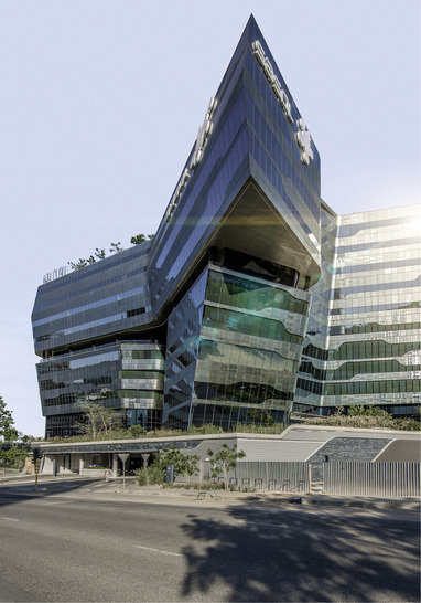 _ Das futuristisch anmutende Headquarter des Industriegiganten Sasol ist Realität gewordener Science-Fiction-Traum. Einem gläsernen Raumschiff gleich schwebt der von der Paragon Group aufwendig konstruierte Prestigebau geradezu über den Straßen Johannesburgs. Doch er sieht nicht nur atemberaubend aus, sondern ist auch funktional voll am Puls der Zeit. Auf zehn Büroetagen mit über 70 000 m2 bietet das 47 m hohe Gebäude ausreichend Platz für 2500 Mitarbeiter. Der Hauptgeschäftsbereich befindet sich in der Mitte des Gebäudes in Johannesburg. Von dort aus erreicht man alle anderen Business Units über spacige Brückenkonstruktionen. Die Arbeitsbereiche selbst sind bewusst offen gestaltet, um den kommunikativen Austausch der Mitarbeiter anzuregen.