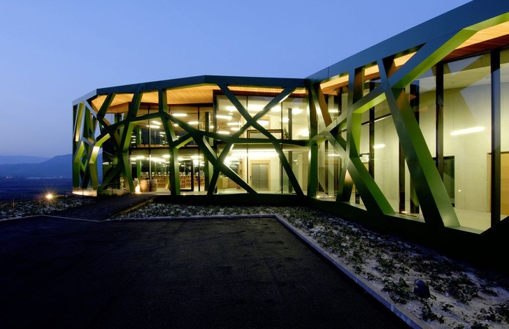 Dies gilt ebenfalls für die dahinter gelegene Structural Glazing Fassade, deren Aluprofile nur raumseitig sichtbar sind. So entsteht nach außen eine flächenbündige Ganzglasfassade, die lediglich durch Schattenfugen strukturiert wird und die „Reben“ entsprechend in Szene setzt. Aus diesem Grund und wegen der hohen auftretenden Windlast verzichtete der Architekt auf einen außen liegenden Sonnenschutz. Die Wärmedämmgläser Gewe-therm von Schollglas sorgen dafür, dass die Räume hinter der Glasfassade nicht überhitzen oder auskühlen.