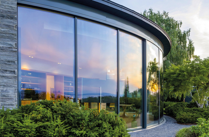 Den Luxus von gebogenen Panoramafenstern kennt man von Pavillonbauten in Parkanlagen. Dieses ganz besondere Wohn- und Lebensgefühl hat sich die Bauherrschaft für ihr Eigenheim in der Ostschweiz ins Private geholt. Die imposante Bauhöhe von 3,9 Metern verleiht der gerundeten Glasfassade mit einer Bogenschiebeanlage von air-lux eine exklusive Anmutung.