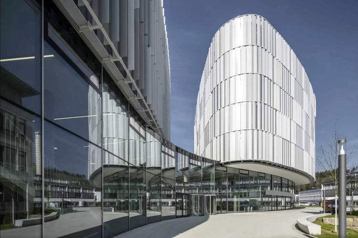 Beim Neubau ihres Kundenzentrums in Schwäbisch Gmünd vertraute die Robert Bosch Automotive Steering GmbH bei der Fassade auf eine multifunktionale Sonnenschutzlösung von Colt International, die sich automatisch auf vielfältige Weise an Wind und Wetter ausrichtet. Das von wulf Architekten, Stuttgart geplante und 2019 fertiggestellte, neue Kundenzentrum besteht aus zwei sanft geschwungenen, vier- bzw. sechsgeschossigen Gebäuden, die je nach Sonnenstand völlig unterschiedlichen Lichtsituationen ausgesetzt sind – und die sich zum Teil auch gegenseitig verschatten. Das Gesamtprojekt gliederte sich in drei Teile: den Neubau eines Kundenzentrums, den Neubau eines Empfangsgebäudes und den Neubau eines Parkhauses.