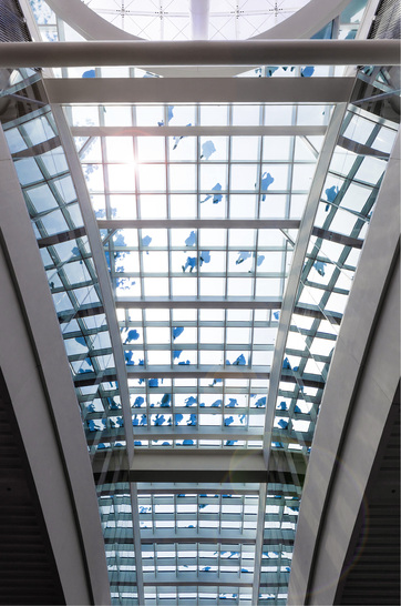 Die Elemente bestehen im Wesentlichen aus Contraflam 120-Brandschutzglas von Vetrotech Saint-Gobain und begehbaren Lite-Floor-Gläsern. Es ist das einzige Verbundglassystem für den Außenbereich, das die extremen Anforderungen von 120 Minuten Feuerwiderstand und Wasserdichtigkeit bei gleichzeitiger Erdbeben- und Tragfähigkeitstauglichkeit inkl. Sicherheitsreserve erfüllt.—