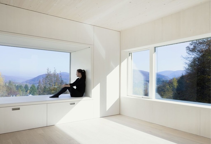 Die Fensteröffnungen – sowohl die Dachflächenfenster als auch die vertikalen Verglasungen – eröffnen wunderschöne Ausblicke, holen Tageslicht ins Haus und maximieren die passiven Solargewinne. Gleichzeitig wird das Einfamilienhaus permanent mit Frischluft versorgt.