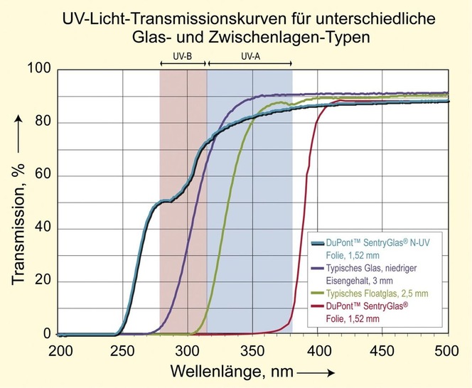 Auf der Sonderschau glass technology live wird DuPont Glass Laminating Solutions mit der SentryGlas N-UV vertreten sein. Hierbei handelt es sich um eine neue Ionoplast-Zwischenlage für Bauverglasungen aus witterungsbeständigem VSG. Da die Folie ohne UV-Blocker hergestellt wird, biete sie eine sehr hohe Durchlässigkeit für die relativ kurzwelligen UV-A- und UV-B-Anteile des natürlichen Lichts. Viele Tiere und Pflanzen benötigen dieses UV-Licht. Damit eigne sich die neue Ionoplast-Zwischenlage für den Einsatz bei Gewächshäusern, Zoos und überall dort, wo UV-Durchlässigkeit benötigt wird.