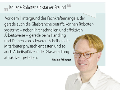 „Der Einsatz von Robotertechnik ist für jeden Anwendungsfall und im Gesamtzusammenhang zu betrachten“, betont Manfred Vollbracht. Bei Serienproduktionen kann das robotergesteuerte Abstapeln die Taktzeiten derart verkürzen, dass gegebenenfalls beschleunigte Prozesse für den Glasweitertransport und das Austauschen der Gestelle konzipiert werden müssen, um Unterbrechungen der Abläufe zu verhindern.