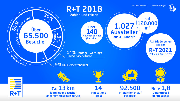 Auch das Rahmenprogramm trug dazu bei, dass die R+T 2018 die Erfolgsgeschichte der Weltleitmesse für Rollladen, Tore und Sonnenschutz weiter fortschreibt: Am Vorabend des ersten Messetages wurde der renommierte R+T Innovationspreises verliehen. Etablierte Inhalte wie die Sonderschau Junge Talente, das R+S-Update, das Torforum, die ift Sonderschau oder der ES-SO Workshop wurden mit der Unterstützung der Partnerverbände umgesetzt, das Angebot um neue Programmpunkte – wie die Sonderschau Outdoor Ambiente Living, das R+T Smart Home Forum oder den 2nd International Congress – Automatic Doors – zielgruppenorientiert ergänzt.