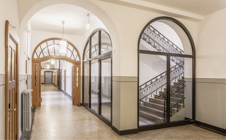 Beim Umbau mussten Denkmalschutzbelangen ebenso Rechnung getragen werden wie Brandschutzanforderungen: Das war eine Herausforderung, denn im Gebäude mit seinen zahlreichen Treppenhäusern, Torbögen und Durchgängen gleicht keine Tür der anderen. Vor allem die vielen unterschiedlichen Bogenformen der Türen waren eine anspruchsvolle Aufgabe für den Glashersteller Vetrotech und die Metallbau Ing. M. Boldt.