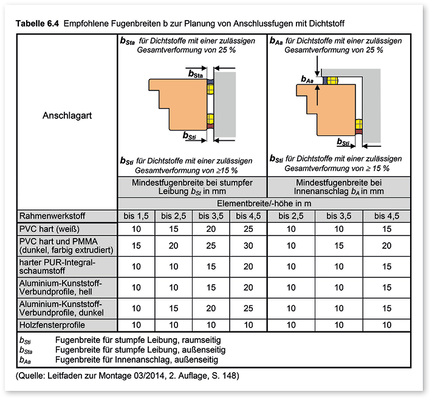 Diese Bewegungen müssen durch die Fuge kompensiert werden. Daher müssen Bauanschlussfugen und die darin enthaltenen Dichtstoffe ausreichend dimensioniert sein. Der Hauptfehler z. B. beim Fenstereinbau sind zu schmale oder vergessene Anschlussfugen. In der Praxis werden Fugendimensionen wie sie in der Tabelle auf der nächsten Seite dargestellt sind, empfohlen (die Tabelle ist auch online unter glaswelt.de im Downloadbereich hinterlegt; einfach Webcode 1391 in das Suchfeld eingeben).