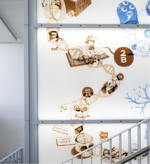 Mit einer Comic-Leuchtwand, die fantasievoll mögliche Entwicklungsgeschichten junger Menschen aufgreift, gewann der renommierte Zeichner Uli Oesterle jetzt den „Kunst am Bau“-Wettbewerb für den Erweiterungsbau des Münchener Michaeli-Gymnasiums. Das farbenfrohe und hinterleuchtete Exponat ziert ab sofort das zentrale Treppenhaus der Schule. Für Brillanz sorgen keramische Farben, die direkt auf ESG gedruckt und bei über 600 Grad Celsius eingebrannt wurden. Anschließend wurde das Kunstwerk mit einer weiteren vorgespannten Gegenscheibe und einer matten Folie als Diffusorschicht zu VSG laminiert. Das sorge dort für maximale Sicherheit.