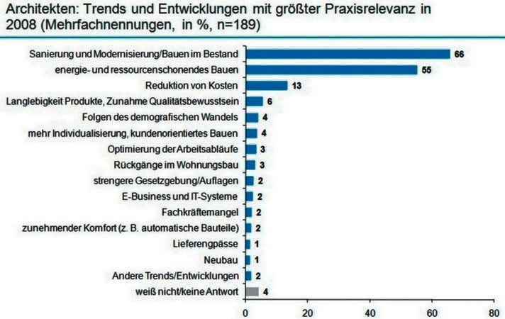 Auf jeden Fall wird Sanierung und Modernisierung bzw. das Bauen im Bestand für den größten Teil der Architekten die Entwicklung mit der größten Praxisrelevanz sein. Dies ist das Ergebnis einer telefonischen Befragung von BauInfoConsult. Energie- und ressourcenschonendes Bauen oder die Reduktion von Kosten sind jedoch ebenfalls Aspekte, die den Arbeitsalltag der Akteure in 2008 bestimmen werden. Andere Aspekte werden die Praxis der Architekten in diesem Jahr wohl mehr oder weniger beiläufig bestimmen. Aspekte wie die Reduktion von Kosten, die Langlebigkeit von Produkten und ein zunehmendes Qualitätsbewusstsein oder beispielsweise die Folgen des demografischen Wandels zählen nur für eine Minderheit zu den Trends und Entwicklungen mit der größten Praxisrelevanz in diesem Jahr.