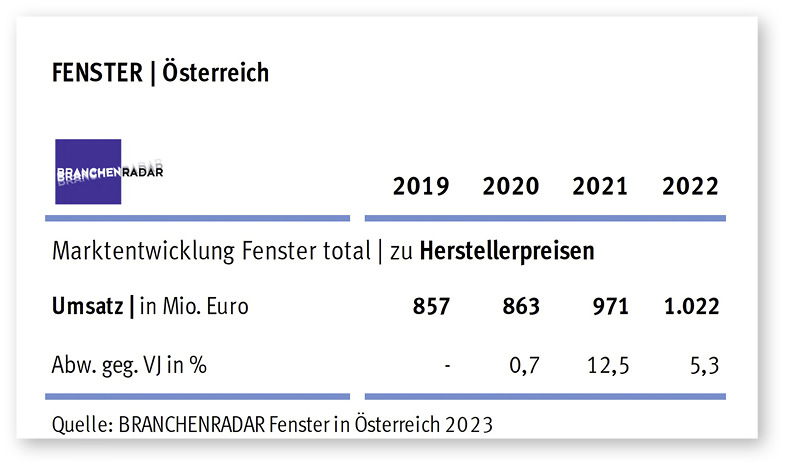 Das Wachstum am österreichischen Fenstermarkt verlor 2022 deutlich an Fahrt. Grund dafür war ein Einbruch am Sanierungsmarkt. Immerhin: Die Verkaufspreise zeigen in eine andere Richtung als die verkauften Stückzahlen. Laut aktuellem Branchenradar Fenster in Österreich erhöhten sich 2022 die Herstellererlöse um 5,3 % auf 1,02 Mrd. Euro. Obgleich damit ein Rekordumsatz erzielt wurde, wird der Jubel bei den Fenstererzeugern verhalten ausfallen. Schließlich sank die Nachfrage um mehr als drei Prozent gegenüber Vorjahr.