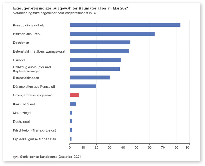 Zum Vergleich: Der Erzeugerpreisindex gewerblicher Produkte insgesamt stieg im gleichen Zeitraum um 7,2 %. Dies war der höchste Anstieg gegenüber dem Vorjahresmonat seit Oktober 2008 (+7,3 %), als die Preise vor der Finanz- und Wirtschaftskrise stark gestiegen waren. Einen großen Einfluss auf die deutliche Preissteigerung des Gesamtindex hatte auch die Entwicklung der Holz- und Metallpreise.