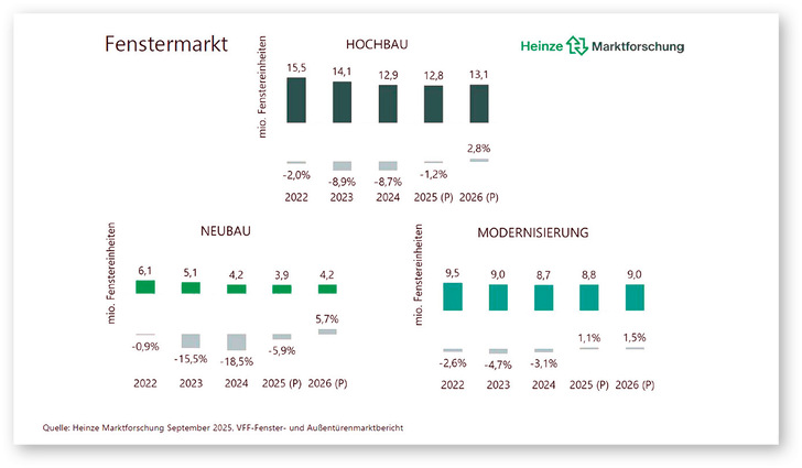Der deutsche Fenstermarkt wird 2025 noch um 1,2 % schrumpfen, doch 2026 rechnen die Branchenverbände mit einem Wachstum von 2,8 % auf über 13 Mio. Fenstereinheiten. Auch der Außentürenmarkt soll 2026 um 2,6 % zulegen.