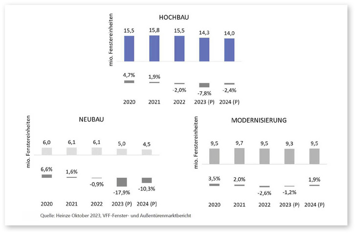 Der Fenstermarkt wird 2023 um fast 8 % schrumpfen – in der Menge. Mit den am 19.10.2023 bekanntgegebenen Marktzahlen wurden die alten Prognose-Zahlen nach unten auf 14,32 Mio. Fenstereinheiten korrigiert. Dabei sorgt vor allem die miserable Situation im Wohnneubau für den starken Einbruch. Dort wird mit einem Minus von fast 22 % gerechnet. Deutlich schwächer dagegen fällt der Rückgang im Sanierungsgeschäft aus: Hier rechnet man mit einem Minus von einem Prozent.