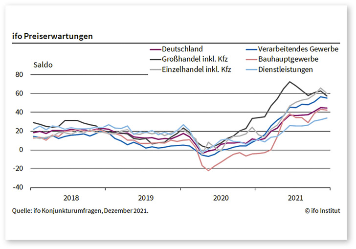 Die sehr hohen Umfragewerte ziehen sich durch alle Wirtschaftszweige. Im Baugewerbe wurde ein Wert von 42 erreicht. Die Saldenwerte bei den Preiserwartungen geben an, wie viel Prozent der Unternehmen ihre Preise erhöhen wollen. Abgezogen wird der Prozentwert derer, die ihre Preise senken wollen. Neutrale Antworten bleiben unberücksichtigt. Der Saldo wurde saisonbereinigt. Das ifo Institut fragt nicht nach der Höhe der geplanten Preisänderung.