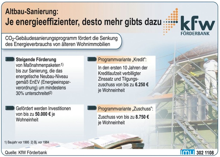 Für Energiesparmaßnahmen beim Bau oder bei der Sanierung von Wohnimmobilien gibt es deshalb lukrative Förderangebote. Für den großen Bereich der Bestandsimmobilien etwa das CO 2 -Gebäudesanierungsprogramm der KfW Förderbank. Darüber werden Investitionsmaßnahmen gefördert, die den Energieverbrauch älterer Objekte senken: Je energieeffizienter das Ergebnis, desto höher die Förderung. In der Spitze können Investoren zinsverbilligte Darlehen für zehn Jahre und einen Tilgungszuschuss in Höhe von 6250 Euro je Wohneinheit erhalten. Privatpersonen, die Eigentümer von Ein- oder Zweifamilienhäusern sind, können alternativ auch einen reinen Zuschuss von bis zu 8750 Euro je Wohneinheit erhalten. Zusätzlich können diese noch einen Zuschuss für Baubegleitung erhalten, der bis zu 1000 Euro je Wohneinheit betragen kann.