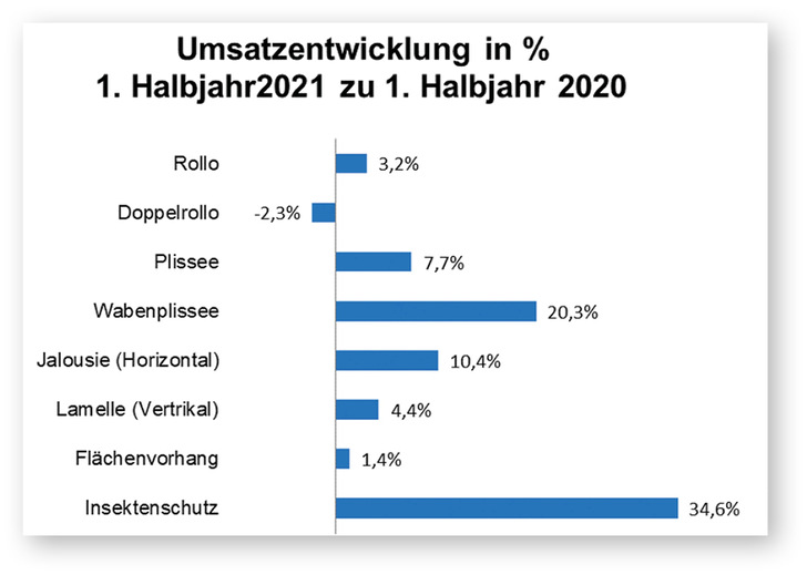 Beim maßkonfektionierten Sicht- und Sonnenschutz wurde bei der Umsatzentwicklung vom 1. Halbjahr 2021 zum 1. Halbjahr 2020 eine Umsatzsteigerung von 12 % und ein Absatzplus von 9 % erzielt, das sonst übliche Sommerloch ist in diesem wie auch im Vorjahr ausgeblieben. Saisonbedingt war der Insektenschutz beim Umsatz mit einem Zugewinn von 35 % und einem Absatzplus von 28 % die stärkste Produktgruppe. Plissees konnten bei Umsatz und Absatz jeweils um rund 7 % zulegen, die deutlich teureren Wabenplissee sogar jeweils um rund 20 %. Dies zeigt, dass die Konsumenten verstärkt höherwertige Produkte nachfragen. Rollos und Jalousien zählten zu den schwächsten Produktgruppen. Dabei haben Doppelrollos ein Umsatzminus von 2 % und einen Absatzrückgang von –4 % zu beklagen. Insgesamt zeigte sich die Branche zufrieden mit den Halbjahresergebnissen und blickt sehr positiv gestimmt in die Zukunft.