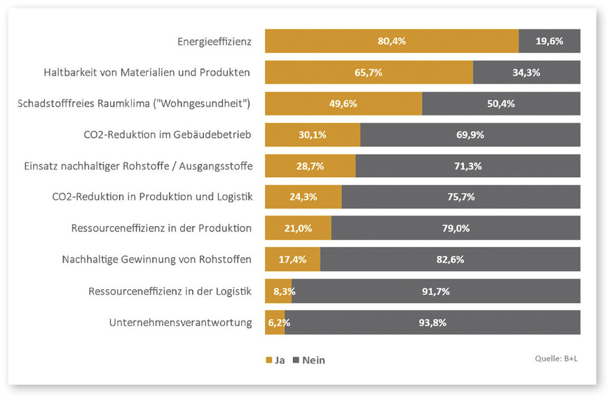Auch aus Sicht der Eigenheimbesitzer ist Energieeffizienz ein wichtiger Baustein von Nachhaltigkeit in der Bauwirtschaft. 80,4 % der von der B+L befragten Eigenheimbesitzer sehen Energieeffizienz als primäres Merkmal von Nachhaltigkeit. Doch auch Haltbarkeit bzw. Langlebigkeit von Bauprodukten spielt im Kontext von Nachhaltigkeit eine wichtige Rolle für die Eigenheimbesitzer.
