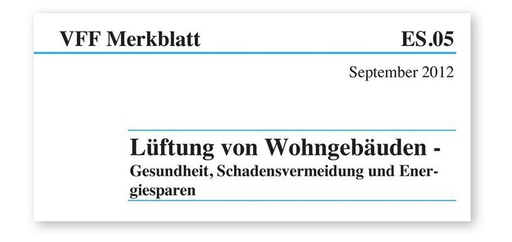 Das Merkblatt ES.05: 2012-09 „Lüftung von Wohngebäuden – Gesundheit, Schadensvermeidung und Energiesparen“ ist als Leseprobe auf der VFF-Homepage im VFF-Bereich „Normung und Technik“ in Auszügen einzusehen. Es kann über den Online-Shop des VFF unter shop.window.de bestellt werden. Der Preis für Nichtmitglieder des Verbands beträgt 19 Euro zuzüglich der anfallenden Versandkosten. VFF-Mitglieder erhalten je ein Exemplar kostenlos und weitere Exemplare zum Sonderpreis.