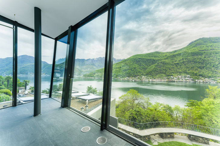 Die Gebäudehülle der „Schwarzen Villa“ besteht aus einer hinterlüfteten Fassadenkonstruktion aus durchgehend schwarzem ESG-Glas. Zur Maximierung des Weitblicks auf den See und die umliegende Landschaft entschied sich die Bauherrschaft für sieben raumhohe, elektrisch öffenbare Schiebefenster von air-lux.