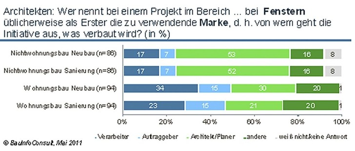 Die deutschen Bauherren verlassen sich bei der Entscheidung über die Fenster vor allem auf die Vorschläge ihres Planers. Im Rahmen der Jahresanalyse von BauInfoConsult wurden 180 Architekten in telefonischen Interviews nach den Initiatoren bei der Entscheidung für eine Fenstermarke gefragt. Nach Einschätzung von rund 50 Prozent der Befragten gibt der Planer sowohl bei Neubauprojekten als auch bei Sanierungsmaßnahmen die Initiative für die zu verwendende Marke. Auch bei der Materialfrage bleibt die Aussage grundsätzlich bestehen, dass der größte Teil der Architekten sich selbst in der Initiatorenrolle sieht.