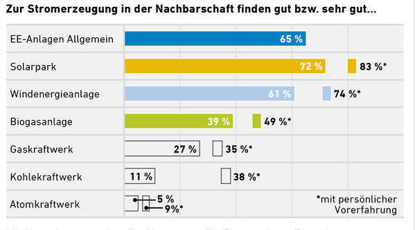 Die meisten Bundesbürger sind mit den Bau von Photovoltaik-, Windkraft- und Biomasseanlagen in ihrer direkten Nachbarschaft einverstanden. Diese Akzeptanz steigt mit den Vorerfahrungen. Die fossilen und atomaren Anlagen sind weniger beliebt.