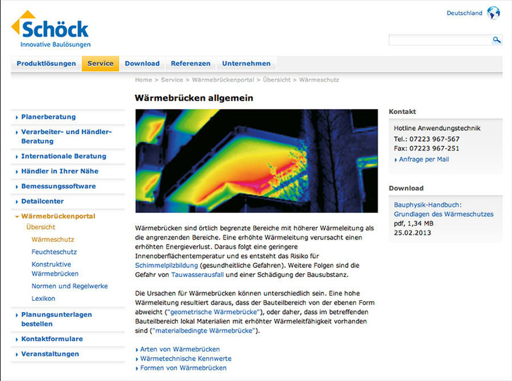Schöck möchte mit seinem Angebot genau den damit verbundenen Informationsbedarf decken. Insbesondere Architekten und Bauphysiker sollen im „Wärmebrückenportal“ Einblicke von den verschiedenen Arten von Wärmebrücken bis hin zu den Folgen wie Energieverlust und Schimmelpilzbildung erhalten. Das Portal soll auch zur Recherche einzelner Themenkomplexe oder Begrifflichkeiten verwendet werden können.